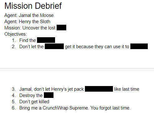 “We intercepted a message that someone plans to assassinate the president. We need you to go undercover to stop the assassination and save the president. Oh, and bring me back a Taco Bell CrunchWrap Supreme, I’m always hungry.”