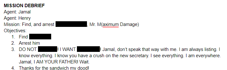 “As you already know,” he started. “Mr. M(aximum Damage) is my twin brother. We became enemies when his wife, Mrs. T(hat’s a lot of damage) divorced him and married me. He now wants to kill me, and take over the CIA.”